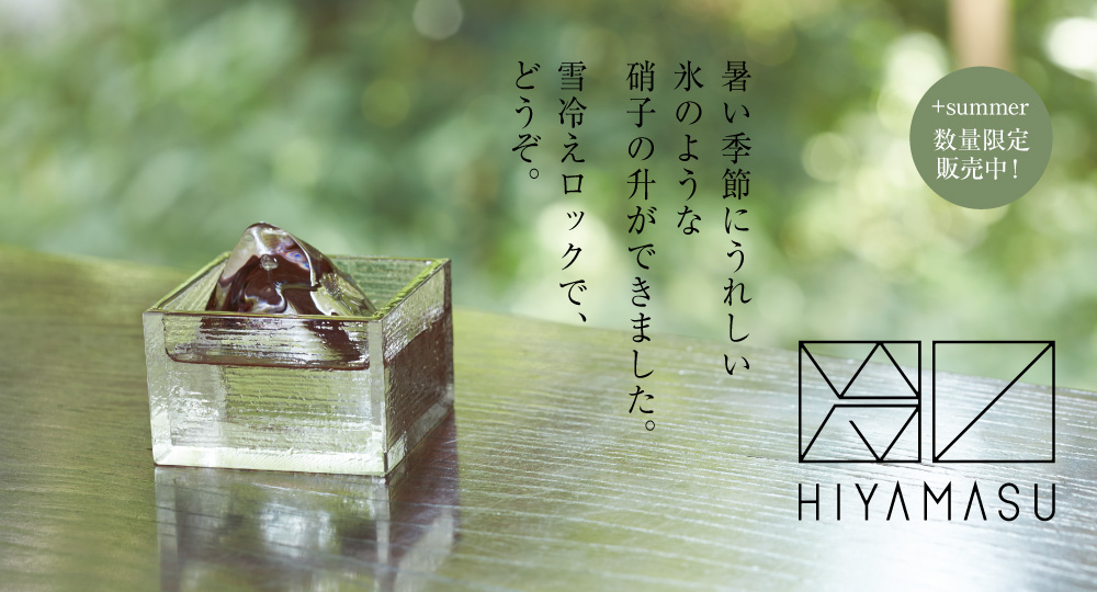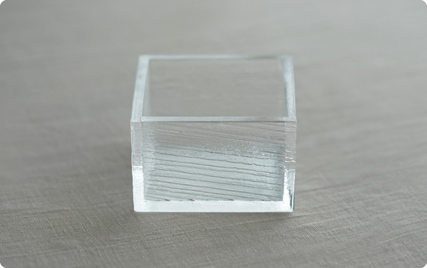 硝子でありながら升のもつ木目などの風合いをいかして一点一点手づくりでつくりあげています。8勺升をベースにつくっていますので、上品なサイズ感をお楽しみいただけます。